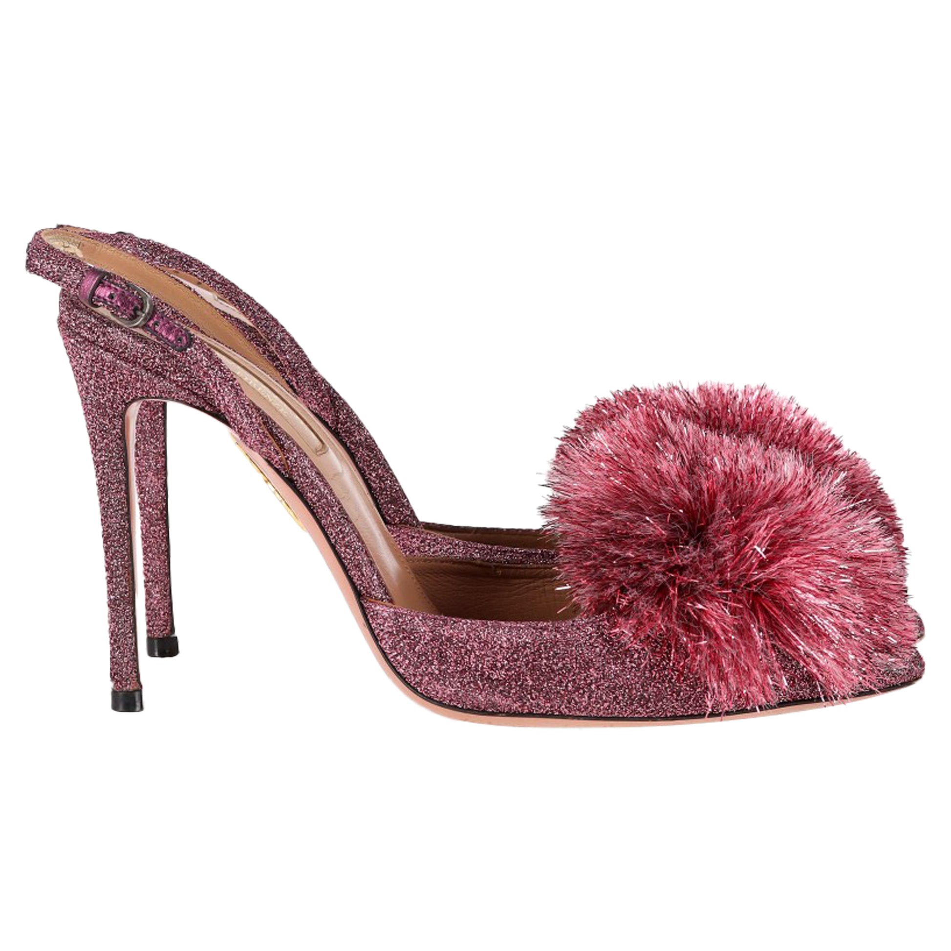 The Aquazzura Pom-Pom Detail Slingback Pumps in Pink Glitter are the perfect blend of playful charm and high-fashion sophistication, featuring vibrant glitter and whimsical pom-pom embellishments. Crafted with luxurious materials, these pumps offer both comfort and style, with a flattering slingback design and a chic pointed toe. The eye-catching pink glitter makes them a standout choice for evening events or special occasions. Pair them with a little black dress or a sleek jumpsuit for a fun yet elegant look that radiates confidence and glamour. Aquazzura Pom-Pom Detail Slingback Pumps in Pink Glitter