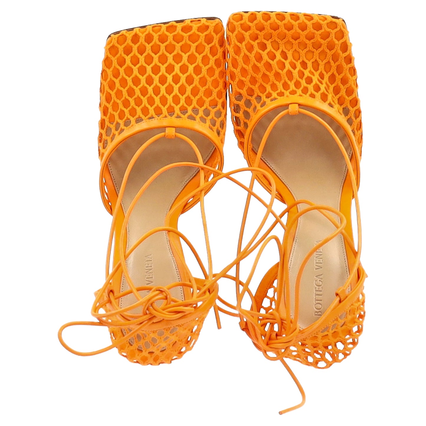 Bottega Veneta's Stretch Lace-Up Sandals in leather showcase the brand's commitment to blending innovative design with luxurious craftsmanship. The stretch mesh construction, paired with leather trim, creates a sleek, flexible fit while the wrap-tie ankle fastenings ensure a secure and customizable fit. With tapered 90mm heels and squared toes, these sandals offer a bold, fashion-forward aesthetic. with Box, Dust bag Bottega Veneta Stretch Lace Up Sandals in Orange Leather