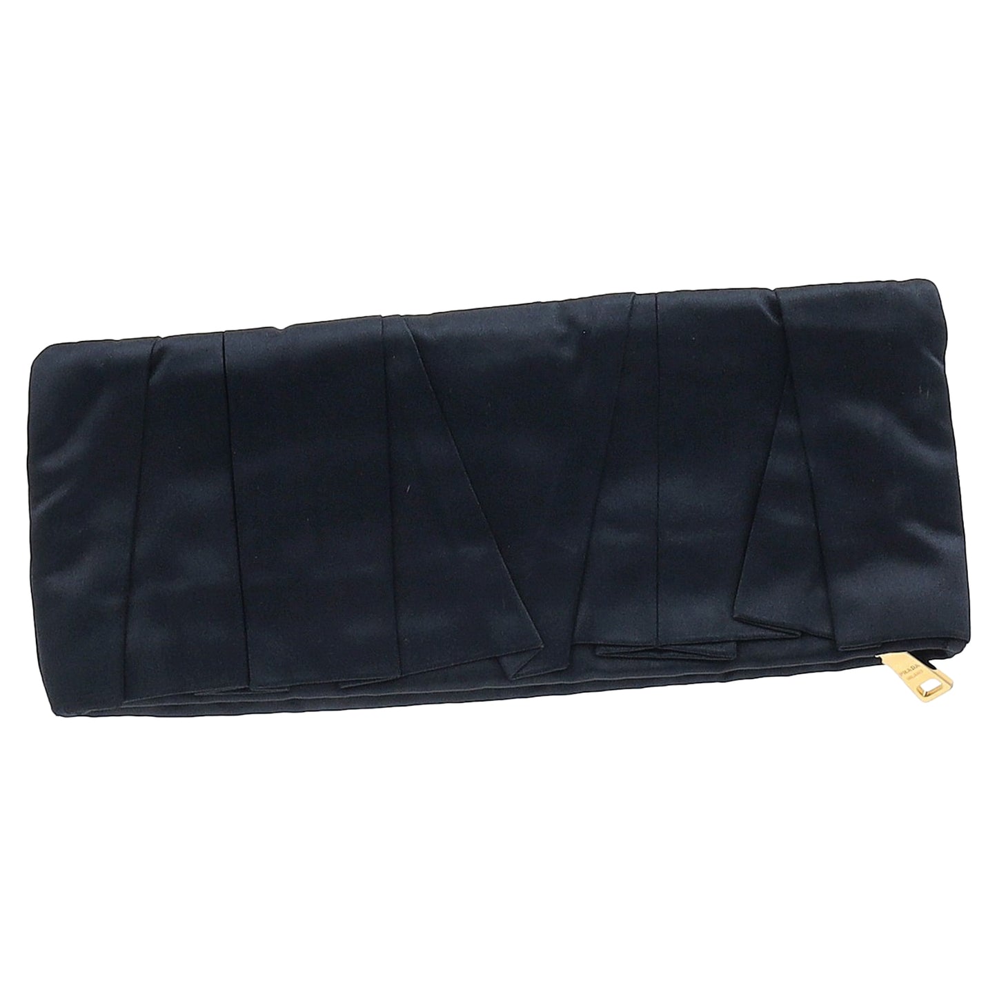 The Prada Pleated Clutch Bag in navy blue satin exudes timeless elegance, with a sophisticated pleated design that adds texture and depth to its sleek silhouette. The tonal satin interior lining and dual interior pockets, including one with a zip closure, offer practical storage while maintaining its chic aesthetic. Finished with a push-closure at the side, this clutch is perfect for evening events where style and function meet. Prada Pleated Clutch Bag in Navy Blue Satin